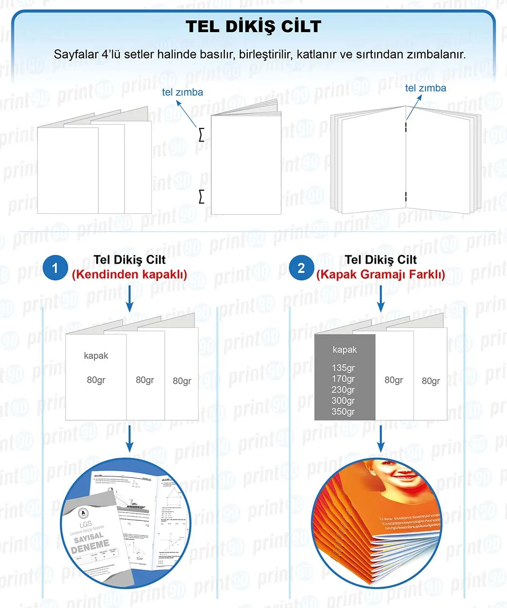 - Tel Dikiş: Sayfaların ortadan zımbalanmasıdır. Genellikle 8-64 sayfa arası, aylık bültenler, tanıtım kitapçıkları ve daha az sayfalı dergiler için idealdir. Ekonomiktir ve sayfaların tam düz açılmasına olanak tanır.