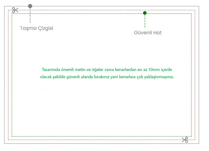Güvenli alan, kesim çizgisinin içinde kalan ve önemli içeriklerinizin (metinler, logolar vb.) yerleştirilmesi gereken bölgedir. Tüm önemli tasarım elemanlarınızı, sayfanın kesilecek kenarlarından en az 10 mm içeride tutmanızı öneririz.